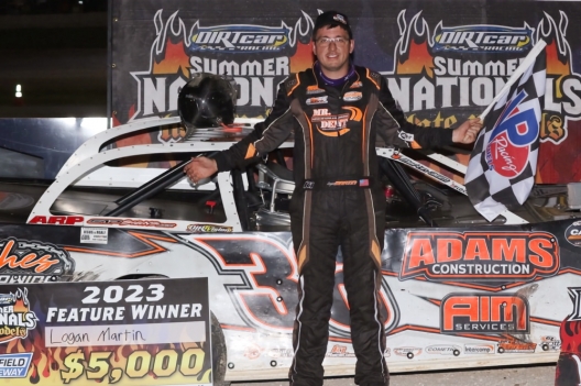 What won the race: Outside front-row starter Logan Martin of West Plains, Mo., led all 40 laps Tuesday at Springfield Raceway, cruising to his first career victory on the DIRTcar Summer Nationals. Martin, who pulled into victory lane with a flat right-rear tire, earned $5,000 for his second overall victory of the season.