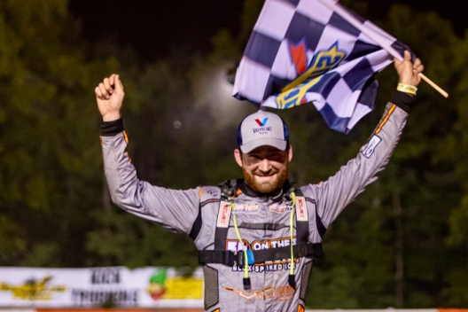 Josh Rice celebrates his victory at Hilltop Speedway.
