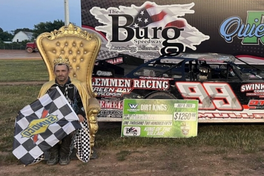 What won the race: Pole-starting Mike Mullen of Seymour, Wis., stuck to the low line and fended off a last-corner challenge from Nick Anvelink, narrowly winning Sunday's $1,250 King of the Village feature at Luxemburg Speedway. Mullen led all 30 laps, beating Anvelink to the line by 0.240 seconds to secure his third Wabam Dirt Kings Tour victory of the season and the fourth of his career.