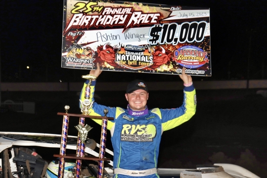 Fifth-starting Ashton Winger of Hampton, Ga., took the lead with an outside move out of turn four and led the final 36 laps to win Saturday's $10,000 Birthday Race at Oakshade Raceway. Winning his second career Birthday Race event, Winger notched his sixth DIRTcar Summer Nationals victory of the season, matching his career best set in 2021. Notching his 12th career Summer Nationals victory, Winger has all but clinched the 2023 series championship and will simply need to show up for Sunday's $5,000-to-win finale at Wayne County Speedway. Colin Shipley moved into the runner-up position on a lap-36 restart and finished 2.833 seconds back.