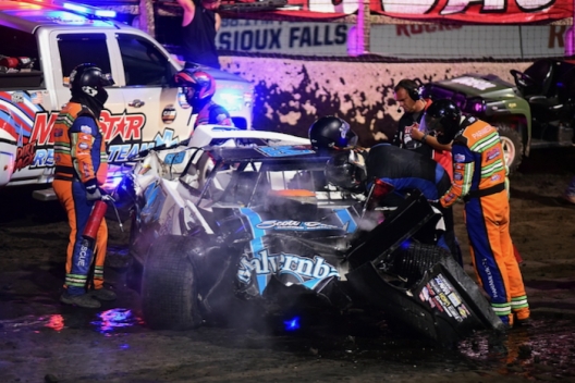Officials check on Jesse Sobbing after his violent wreck. The Malvern, Iowa, driver was sore but otherwise OK.