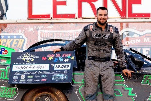What won the race: Pole-starting Mason Zeigler of Chalk Hill, Pa., led all 50 laps to win Friday's rain-postponed Autism Awareness feature, collecting $10,000 for topping the DIRTcar Super Late Model field at Lernerville Speedway. Zeigler notched his second victory of the season by 1.313 seconds over Alex Ferree.