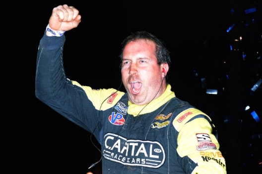 Friday-night feature winner Steve Casebolt proved he’s primed to go for two in a row with a spectacular victory, passing Billy Moyer off the final corner to emerge triumphant by a mere 0.035 of a second. Josh Richards settled for third after sliding over the cushion early and Tony Knowles placed fourth after turning back a challenge from Darrell Lanigan, who ran most of the distance with his car’s right-rear spoiler damaged from an early bout with the homestretch wall.