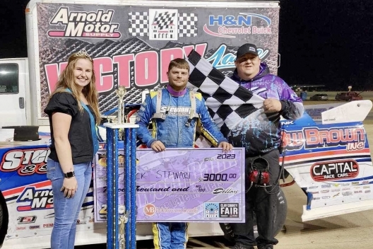 What won the race: Powering around the outside of Andrew Kosiski at turn-four exit on lap 20, second-starting Derrick Stewart of Ainsworth, Iowa, led the final six laps to win Tuesday's $3,000 Battle of the Blue Ribbon at Clay County Fair Speedway. Stewart led twice for seven laps (1, 20-25) to secure his first career Malvern Bank Series victory in the inaugural visit to the Spencer, Iowa, oval and notched his second triumph of the season after topping June 2's Hoker Trucking Series stop at Columbus Junction (Iowa) Speedway.
