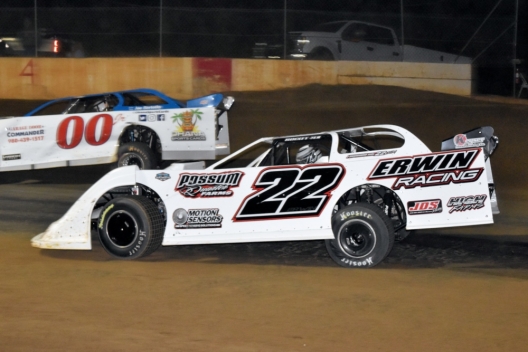 Key notes: Third-starting Dustin Mitchell trailed Erwin for the entire distance, finishing 1.186 seconds back. ... Second-starting Michael Batten gave way to Mitchell on the opening lap and rounded-out the podium. ... Sixth-starting Michael Rouse and 10th-starting Christian Thomas each took advantage of the lap-seven restart, finishing fourth and fifth. ... Gray Parton improved three positions and finished sixth. ... Matthew Bissette and Roger Lucas each gained four spots, finishing eighth and 10th. ... Series points leader Ben Watkins was involved in a multicar incident on lap six that required 25 minutes for cleanup; Watkins was able to continue and finished ninth, while Steve Banal, Willie Milliken, Cy Nelms Sr., Bobby Liles, Dale Arnold and David Yandle all retired from damage. ... Saturday's 36-minute main event was slowed by the one lengthy lap-six melee and saw 11 competitors complete 40 laps, with 13 running at the finish. ... Spencer Liggon scratched from the feature.