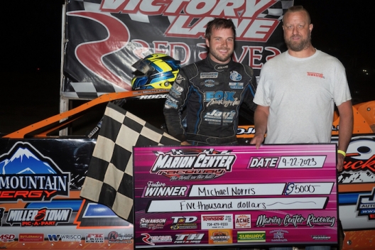 What won the race: Taking the lead from polesitter Colton Flinner on lap 15, Michael Norris of Sarver, Pa., led the rest of the way to win Friday's unsanctioned Super Late Model feature at Marion Center Raceway. Norris finished 2.627 seconds ahead of Dylan Yoder for a $5,000 payday with Saturday's $6,000-to-win finale still on the line.