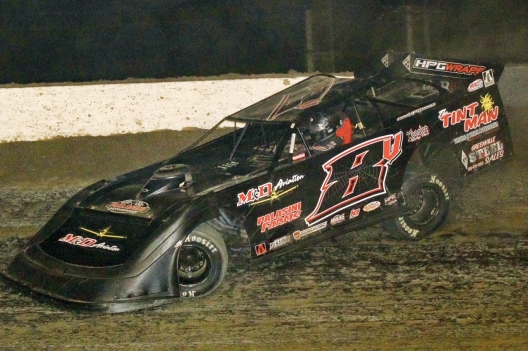 Mike Palasini Jr. heads for a $5,000 victory at Greenville Speedway.