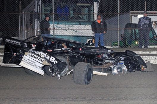 Jared Landers overtook Gregg Satterlee for the lead on lap two and beat Satterlee to the finish line by 1.413 seconds. A three-car battle for the third and final transfer spot saw Charles LaPlant top Tyler Bruening and Chad Hollenbeck for the show position. Just six cars contested the event; Steve Francis and Jordan Yaggy scratched (Yaggy entered the evening's program just to take hot laps), while Rick Eckert tagged the rear just to get some practice circuits on his new car.