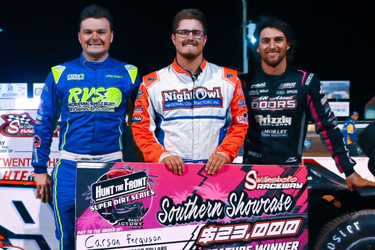 What won the race: Snatching the lead on a lap-45 restart from race-long dominator Cody Overton, Carson Ferguson of Lincolnton, N.C., controlled the remainder of the distance to claim Saturday night’s 60-lap Hunt the Front Super Dirt Series Southern Showcase at Swainsboro Raceway. The 23-year-old driver beat Ashton Winger to the finish line by 1.229 seconds for a career-high $23,000 winner’s check.