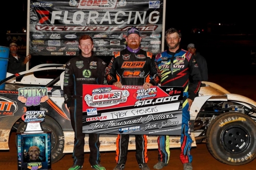 What won the race: Making an inside move at turn-two exit while Kyle Beard was mired in lapped traffic, fourth-starting Tyler Stevens of Searcy, Ark., led the final 29 laps to win Saturday's $10,000 30th annual Spooky 50 at Super Bee Speedway. Stevens notched his first Comp Cams Super Dirt Series victory of the season and the fourth of his career, all coming in the Pelican State.
