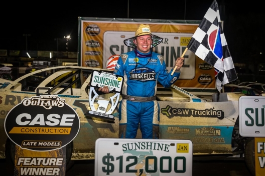 Flexing his muscle again at Volusia Speedway Park, Devin Moran of Dresden, Ohio, overtook Ricky Thornton Jr. for the lead on lap 26 and turned back a late challenge from Brandon Sheppard to capture Friday night’s frenetic 35-lap World of Outlaws Case Late Model Series season opener. Moran beat Sheppard to the finish line by 0.720 of a second for the $12,000 top prize in a race that was slowed by just a single caution flag and boasted four different leaders.