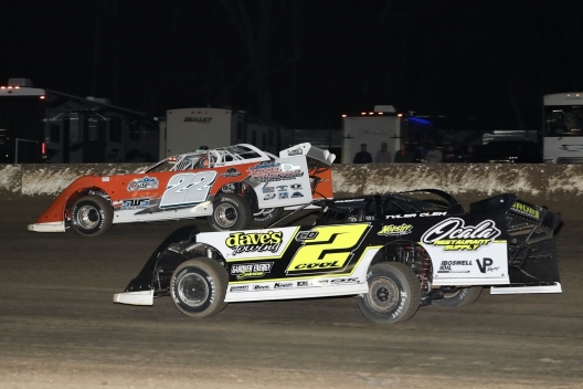 Tyler Clem (co2) passes Jeremy Steele (22) and leads the final 17 laps to win $5,000.