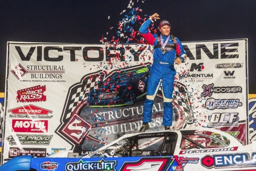 Quotable: “I was getting scared because I saw (Shane Sabraski) right behind me and this is his home track, so I was getting a little paranoid,” Peterson said. “We had a lot of time to think about it during that open red (flag). The tires, first of all, tried warming those up as soon as we got back going, they seal over pretty quick. That’s what you’re thinking about (under the red) .. I looked up at the scoreboard, you got Shane right behind me that’s got a million laps here .. just had to run a consistent line and we did that and got the win.”