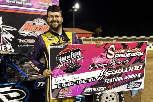 What won the race: Fighting off repeated challenges from Friday's prelim winner Brandon Overton, polesitter Dalton Cook of Smiths Station, Ala., led all 50 laps Saturday at Swainsboro Raceway for a career-high $20,000 payday on the Hunt the Front Super Dirt Series. In a frenetic final lap, Michael Page pressured Cook from second with Cody Overton third ahead of older brother Brandon, who ran second most of the way but settled for fourth.
