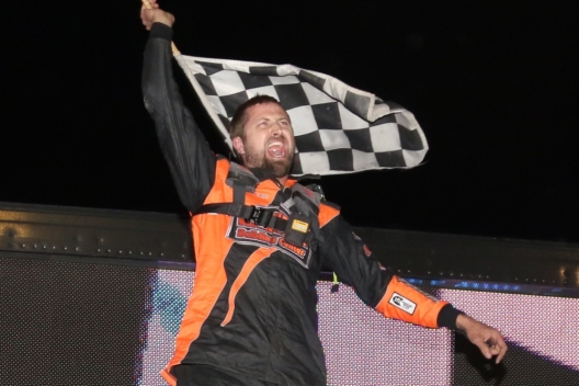 Dustin Strand celebrates his last-lap victory at River Cities.