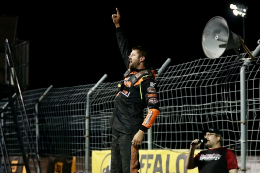 Dustin Strand celebrates in victory lane at Red River Valley.