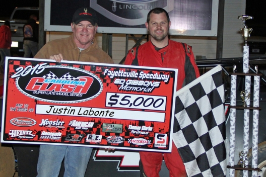 What won the race: Justin Labonte of Trinity, N.C., led all 40 laps to top Donald Bradsher of Burlington, N.C., for his first career Carolina Clash victory and a $4,000 triumph in Ed Gibbons Memorial at Fayetteville Motor Speedway.