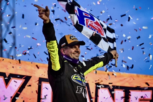 Brian Shirley celebrates his first World of Outlaws victory in more than a year.