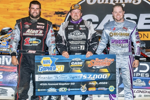 Repelling race-long challenges from first prelim winner Ryan Gustin, pole-starting Brandon Sheppard of New Berlin, Ill., hung on to score a flag-to-flag victory in Friday's second 30-lap NAPA Auto Parts Gopher 50 prelim at Deer Creek Speedway. Sheppard secured his third World of Outlaws Case Late Model Series victory of the season and the 86th of his career, further extending his all-time lead.