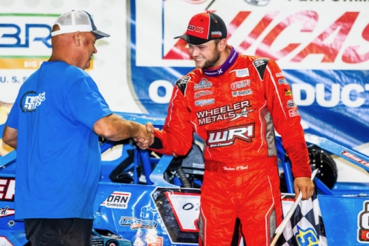 Key notes: O'Neal, who rejoined the SSI Motorsports team last week in replacing Thornton and won Monday at Eagle Raceway, notched his 26th career Lucas Oil victory. ... O'Neal pounded his car's roof in victory lane as he heard some boos from the crowd, noting the "mixed emotions" in his victory lane interview. ... Former Iowa resident Ricky Thornton Jr., who ran the extreme high side in the final laps, led the first 14 laps and laps 19-22 in making a bid for his first victory with his new Koehler Motorsports team. ... Third-starting Moran slipped back to fifth early before securing a podium spot in the late stages. ... Sixth-starting Garrett Alberson led laps 15-18 after going from third-to-first on a restart. ... Thornton and Alberson got together on lap 26 exiting turn two with Thornton nearly sideways, but both survived a skirmish that briefly appeared as if it would trigger a backstretch pileup. ... Devin Moran clipped an infield tire and Daulton Wilson made contact exiting turn two with seven laps left but both soldiered on with Wilson briefly showing smoke. ... Flat tires stung top-10 runners Tim McCreadie and Jimmy Owens among others. ... Three cautions slowed the action, the third and final one on lap 44 for debris. ... Drake Troutman slowed on lap 41. ... The first yellow appeared when Tad Pospisil got sideways on the 15th lap after slight contact with Ross Robinson. ... In heat action, Mike Marlar tangled with O'Neal and the resulting damage forced him to take a provisional starting spot in the feature; he started 23rd and finished 11th.