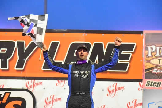 Bill Leighton Jr. celebrates his $5,053 victory in Malvern Bank West Series action at Huset's Speedway.