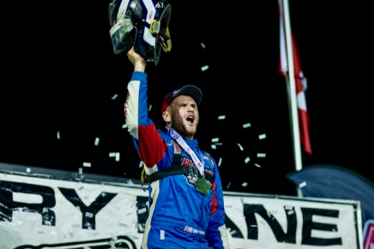 Tyler Peterson celebrates his fourth WISSOTA Challenge Series victory.