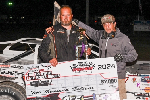 What won the race: Repelling mid-race challenges from Cole Searing and then late-race pressure from Blair Nothdurft, second-starting Chad Becker of Aberdeen, S.D., scored a green-to-checkered victory in Friday's 25-lap Repairable Vehicles.com Tri-State Late Model Series feature at Miller Central Speedway. Becker bagged a $2,000 triumph, his third of the season on the Tri-State Series and the sixth of his career.