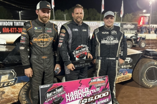 What won the race: Leading all but the first lap, pole-starting Jason Jameson of Lawrenceburg, Ind., claimed Friday’s Harold Hardgrove Memorial opener at Lake Cumberland Speedway. Jameson, overcoming right-rear quarter panel damage, powered ahead of Josh Rice on the second lap and drove away with the $5,000 Hunt the Front Super Dirt Series victory.