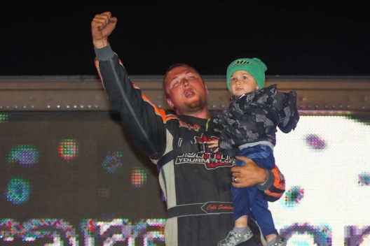 Cole Searing celebrates his $9,200 John Seitz Memorial victory.