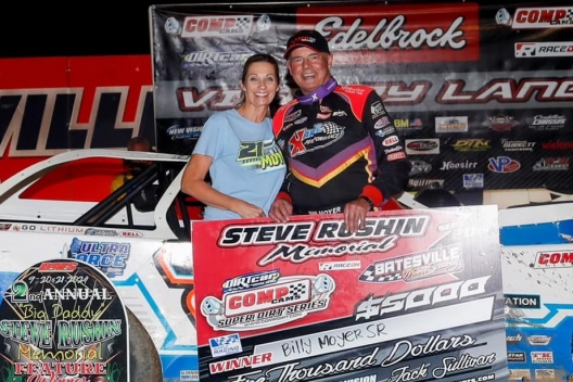 What won the race: Sliding by race-long pacesetter Jon Mitchell on lap 31, second-starting Billy Moyer of Batesville, Ark., led the rest of Friday's 35-lap Steve Rushin Memorial opener at Batesville Motor Speedway. Moyer's $5,000 win marks his 14th career Comp Cams Super Dirt Series victory and his first since earning $3,000 on April 2, 2021, at Poplar Bluff (Mo.) Motorsports Park.