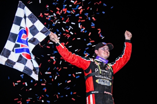 Cory Hedgecock celebrates his victory in the Butterball Wooldridge Memorial at Richmond Raceway.