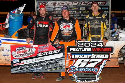 What won the race: Powering under race-long leader Shane Hebert exiting turn four on lap 20, second-starting B.J. Robinson of Bossier City, La., led the rest of Friday's 40-lap First Responders Night at 67 Speedway of Texarkana. Robinson sped to the $5,000 payday by 1.154 seconds over third-starting Jon Mitchell, earning his third Comp Cams Super Dirt Series victory of the season and the sixth of his career.