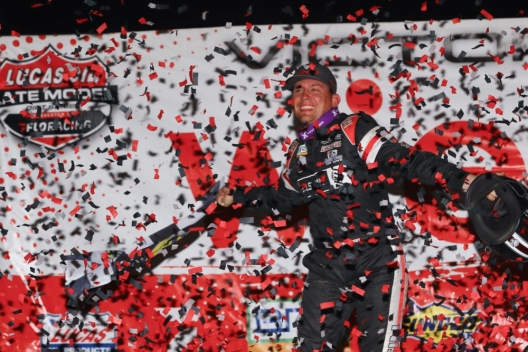 Devin Moran celebrates his $25,000 victory at Ocala Speedway.