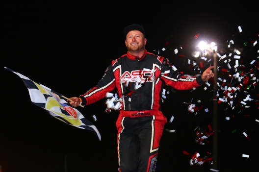Ethan Dotson celebrates his first-ever World of Outlaws victory in Friday's Illini 100 opener at Farmer City Raceway.