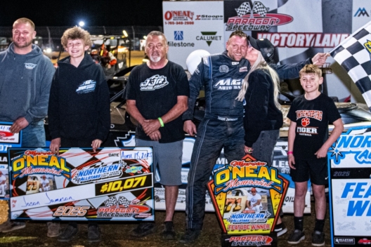 What won the race: Using a momentous lap-35 restart where he powered into the lead from third, Jason Jameson of Lawrenceburg, Ind., stunned race-long pacesetter Hudson O’Neal, the grandson of the race honoree, to capture the inaugural Marvin O’Neal Memorial at Paragon Speedway on the Northern Allstars Late Model Series. Jameson pocketed $10,071.