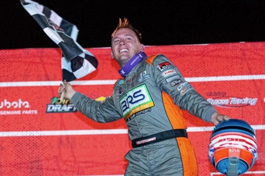 Devin Moran celebrates a $20,000 FloRacing Night in America victory at Lincoln Speedway.