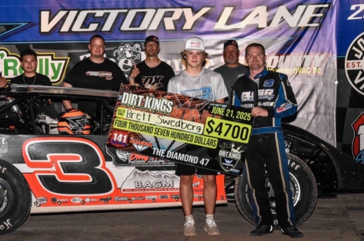 What won the race: Making a late high-side charge, Brett Swedberg of Shawano, Wis., rolled around race-long leader and polesitter Nick Anvelink in traffic and grabbed a career-high $4,700 victory in Wabam Dirt Kings Tour action Saturday at 141 Speedway. The third-starting Swedberg took the checkers 0.632 of a second ahead of Anvelink, the tour's all-time wins leader in the Diamond 47 for his fourth career series victory.