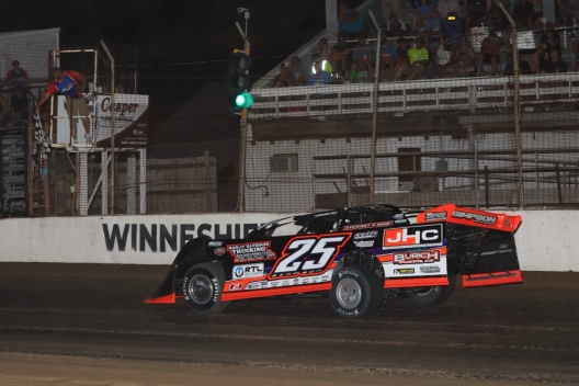 Chad Simpson takes the $4,000 checkers at Winneshiek Raceway.