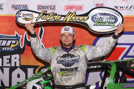 Second-starting Tyler Erb of New Waverly, Texas, fired off from the outside front-row and dominated Wednesday's 30-lap DIRTcar Summer Nationals feature at Spoon River Speedway. Terbo took the checkers 0.890 of a second ahead of Bob Gardner for the $5,000 payday, his fifth Summer Nationals win of the season and 20th of his career.