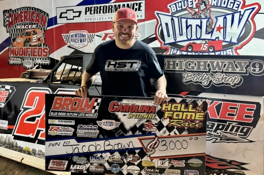 What won the race: Jacob Brown of Gaffney, S.C., held off Matt Long and beat him to the checkers by 0.987 to win Friday night's 40-lap Hall of Fame Race at Carolina Speedway. Brown bagged his second career Cagle Automotive Blue Ridge Outlaw Late Model Series victory, his second this season after winning June 14's $3,000 stop at Harris Speedway in Rutherfordton, N.C.