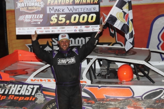 Pole-starting Mark Whitener of Middleburg, Fla., paced all but the opening circuit to win his inaugural DIRTcar Summer Nationals feature Thursday at Butler Motor Speedway. Whitener took the checkers 1.746 seconds ahead of Cody Overton, last night's series winner at Montpelier (Ind.) Motor Speedway, to collect the $5,000 payday.