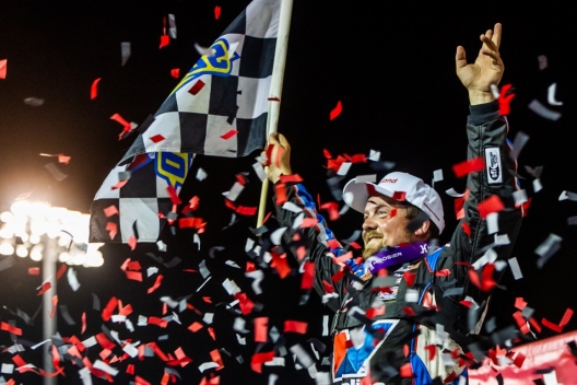 Brandon Sheppard celebrates at Lucas Oil Speedway.