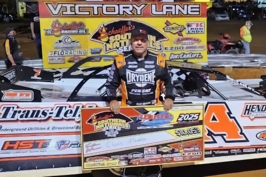 What won the race: Leading all the way, winningest series driver Chris Madden of Gray Court, S.C., won on the Schaeffer's Southern Nationals at Wythe Raceway for the second consecutive year, collecting $10,053. Madden, making part-time starts in 2025 and recently connecting with KGM Motorsports, took the checkers 5.309 seconds ahead of runner-up Chris Ferguson.