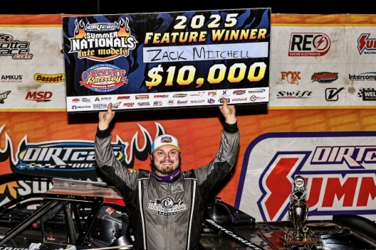 Continuing his fantastic first-ever week on the DIRTcar Summer Nationals, Zack Mitchell of Enoree, S.C., led all 40 laps Saturday at Oakshade Raceway for a $10,000 payday and his third victory in five starts. Mitchell ran virtually unchallenged in taking the checkers 1.120 seconds ahead of Trey Mills.