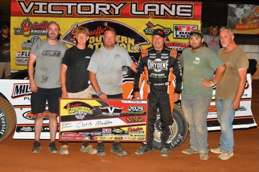 Key notes: Madden also won Saturday night's $10,053 stop at Wythe Raceway in Rural Retreat, Va. ... His 31st career Southern Nationals victory further extends his advantage on the tour's all-time win list. ... Seventh-starting Mike Marlar, fresh off a $15,000 World of Outlaws victory Saturday at Ohio's Sharon Speedway, pressured Madden in the late going before nearly tangling with a lapped car and fading back at the checkers. ... Mike's younger brother, Camaron Marlar, charged from 10th-to-third between laps 19-34, but settled for third in the closing stages. ... Camaron incidentally made contact with Dale McDowell, sending McDowell hard into the backstretch wall as they battled for third on lap 34, bringing out the race's lone stoppage. McDowell was unable to continue and credited with 18th. ... Second-starting Garrett Smith led the opening 37 laps before Madden worked his way by, then slipped to sixth in the final laps. ... Blake Brown improved five positions and finished seventh aboard Vic Hill's No. 1 entry. ... Beckham Malone overcame a hot lap crash to finish 13th after utilizing a provisional starting position. Malone made contact with Brandon Hardgrove who slowed abruptly after a fire ignited under his hood; both drivers were OK, but Hardgrove scratched for the night. ... Jordon Horton pulled off before taking the green. ... The event honored Scott Sexton, the late Volunteer track champion and driver of the No. 52 Dirt Late Model who amassed more than 200 feature wins in his storied career. Sexton died in 2013 at the age of 46. ... The 52-lapper lasted just shy of 17 minutes, with 12 starters completing the distance.