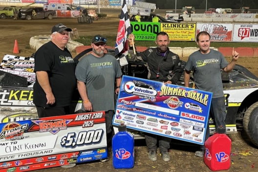 What won the race: Surviving a last-lap scare, outside front-row starter Clint Keenan of Pataskala, Ohio, led all nonstop 30 laps of Saturday’s Summer Sizzle at Atomic Speedway for his first major touring victory. The 40-year-old Keenan edged R.J. Conley by 0.276 of a second to earn $5,000 in the event co-sanctioned by the Valvoline American Late Model Iron-Man and Ultimate Heart of America Series, his first triumph on either tour.