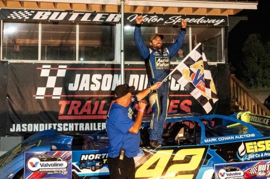 What won the race: Overtaking race-long leader Rusty Schlenk on the 22nd lap, third-starting Chad Finley of St. Johns, Mich., paced the final nine circuits to capture his first career Valvoline American Late Model Iron-Man Series victory at Butler Motor Speedway, worth $5,000. Finley beat Schlenk to the line by 0.504 of a second for his fourth overall feature win this season and third since debuting a new Longhorn Chassis at the beginning of the month.