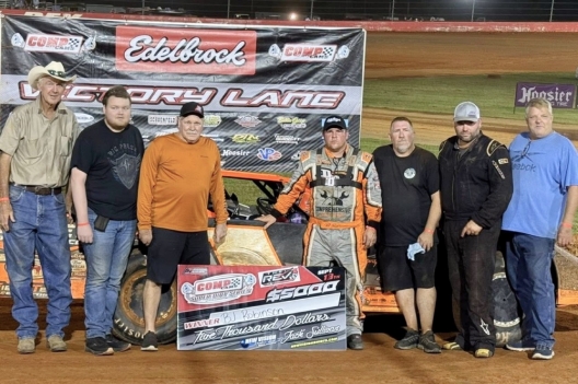 Key notes: Robinson grabbed his first feature win this season and first Comp Cams win since last Oct. 18 at 67 Speedway of Texarkana (Ark.), also worth $5,000. ... Teenager Eli Ross rallied to finish sixth after bringing out a caution on the fourth lap. … The 30-lap feature was marred by three failed starts, including an early tangle between Chance Mann and Shane Stephens on the initial attempt. … Clay Stuckey rebounded to finish fourth after triggering a caution during the second failed start. … Morgan Bagley, winner of Friday's $5,000 opener, finished fifth. ... The main event lasted 34 minutes, with eight starters running at the finish. ... Curtis Cole scratched.