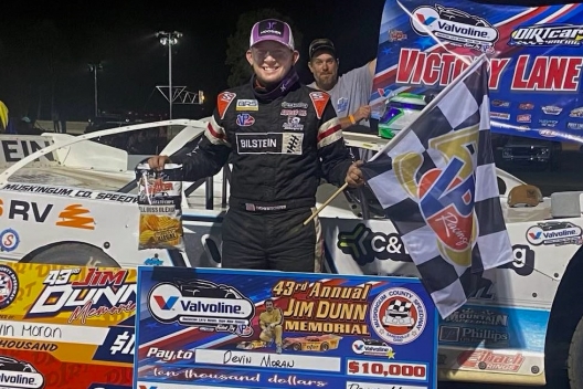 What won the race: Dominating Saturday at his family's Muskingum County Speedway, Devin Moran of Dresden, Ohio, won the 43rd annual Jim Dunn Memorial for the fifth time in the last six runnings of the event for a $10,000 payday on the Valvoline American Late Model Iron-Man Series. The pole-starting Moran fought off Tyler Carpenter, then won by 2.306 seconds ahead of ninth-starting Clint Keenan at the checkers in the 40-lapper.