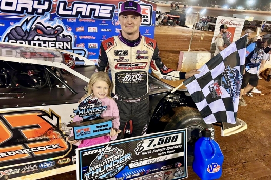 What won the race: Sliding by early leader Dale McDowell amid traffic on lap 11, fourth-starting Cory Hedgecock of Loudon, Tenn., led the rest of Saturday's 50-lap Young Memorial feature at North Georgia Speedway. Hedgecock beat McDowell by 1.476 seconds for the $7,500 payday and his second straight Southern Thunder Super Dirt Series triumph, his first aboard a new Longhorn Chassis.